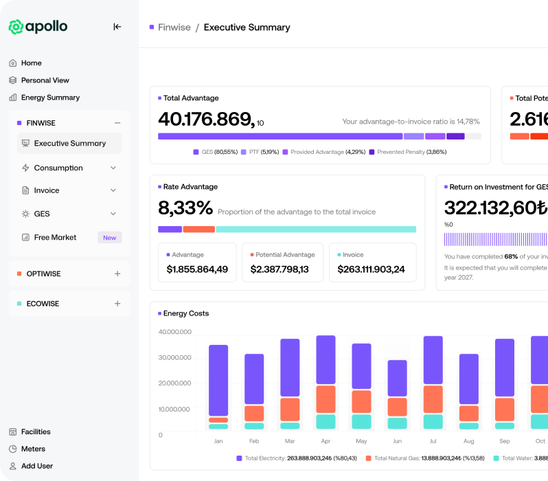 Apollo Finwise, enerji maliyetlerinin nereden geldiğini, neden değiştiğini ve nasıl optimize edileceğini anlamanızı sağlar.